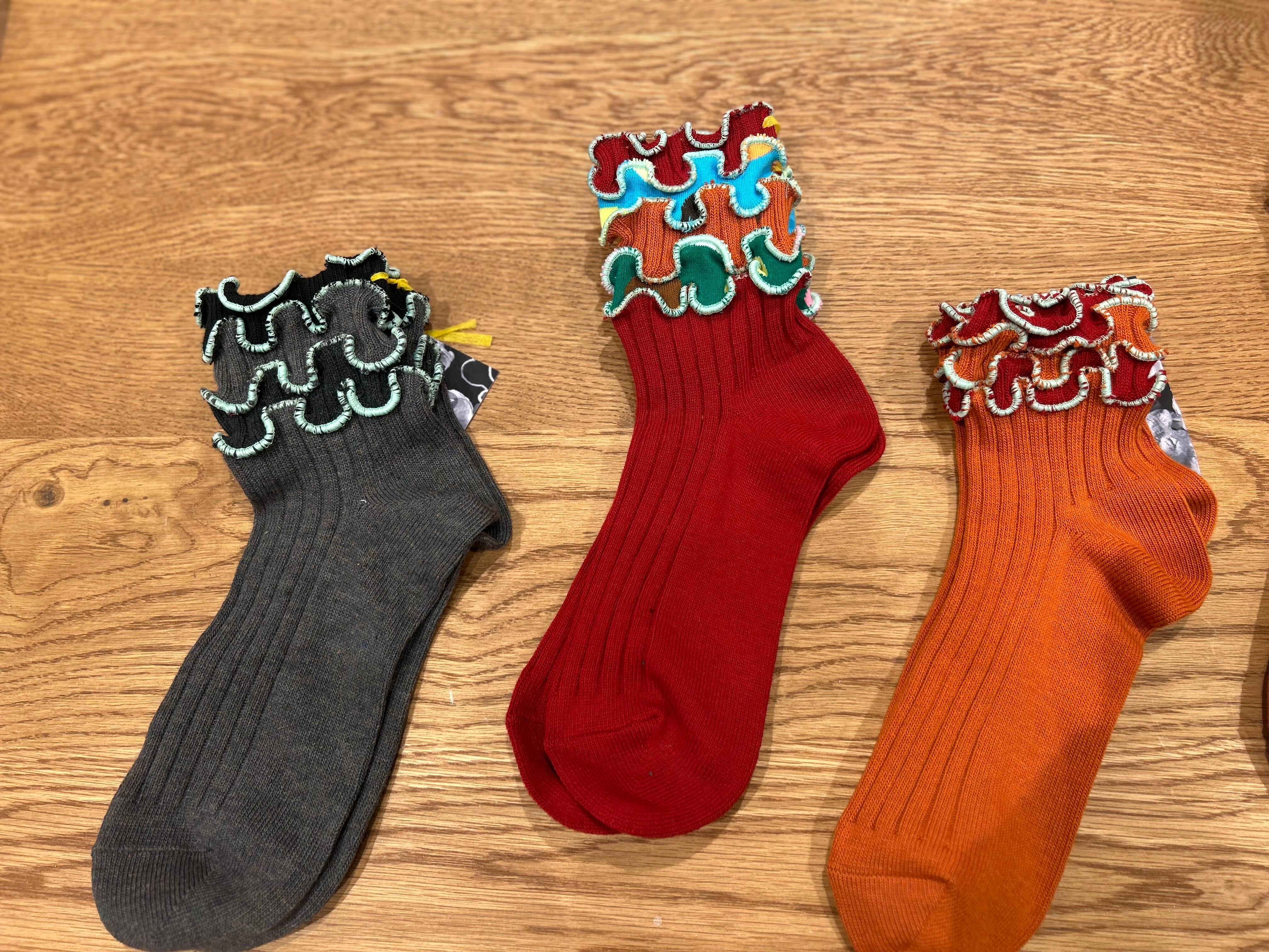 ご来店ありがとうございます!オンリーワンなアートな靴下、22〜25cmサイズをご用意しました。奈良県で生産されたつぎばぎにしあげたデザインが特徴です。足元からおしゃれを楽しみたい方にぴったりの逸品です。柔らかい素材で履き心地も抜群ですよ。