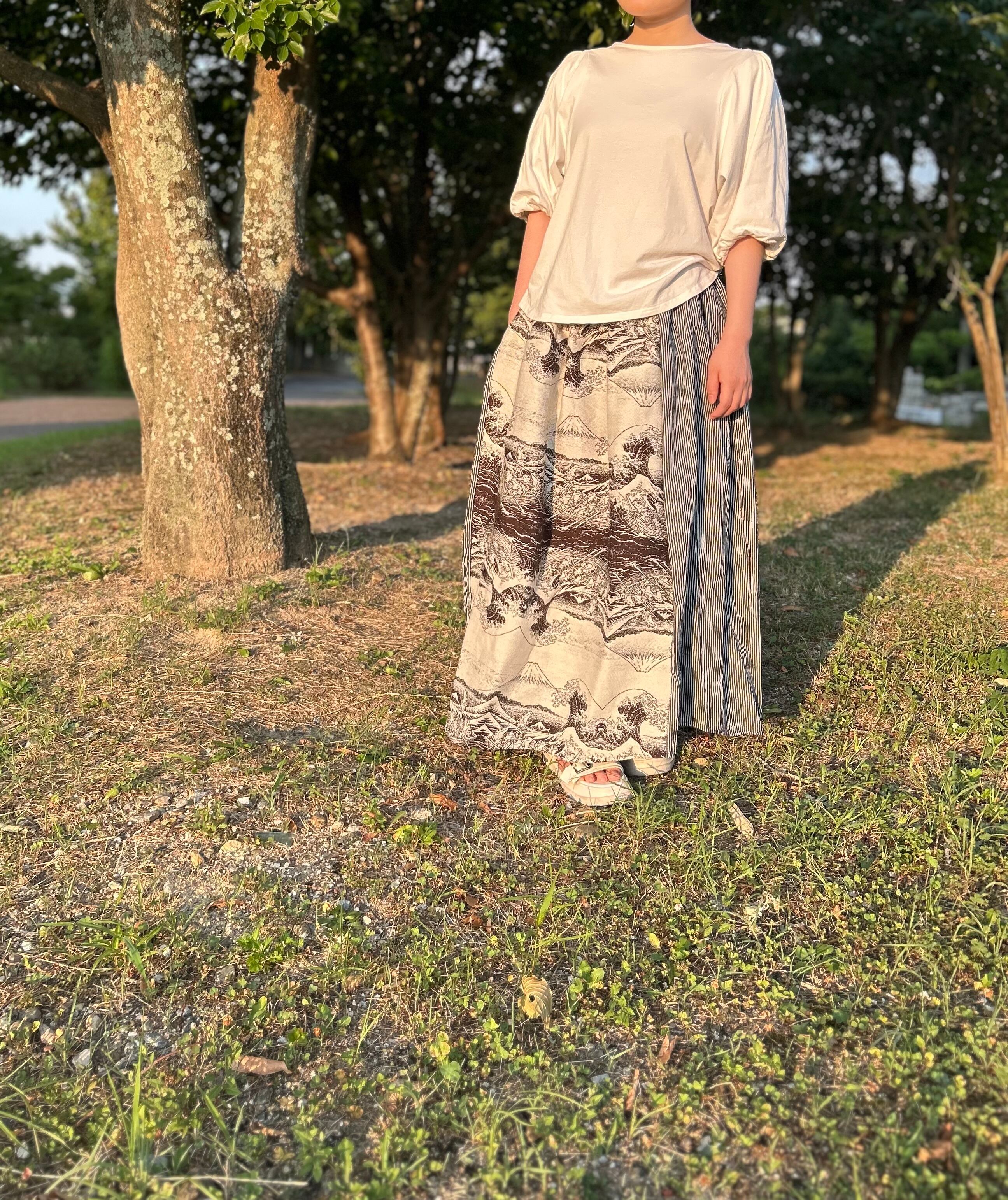 ご来店ありがとうございます!北斎をテーマにしたユニークな播州織スカートが登場しました。フリーサイズで、調節ひもも付いているため、自分だけのスタイルを楽しめます。特徴的なパロディ生地は、周囲の目を引き付けること間違いなしです!