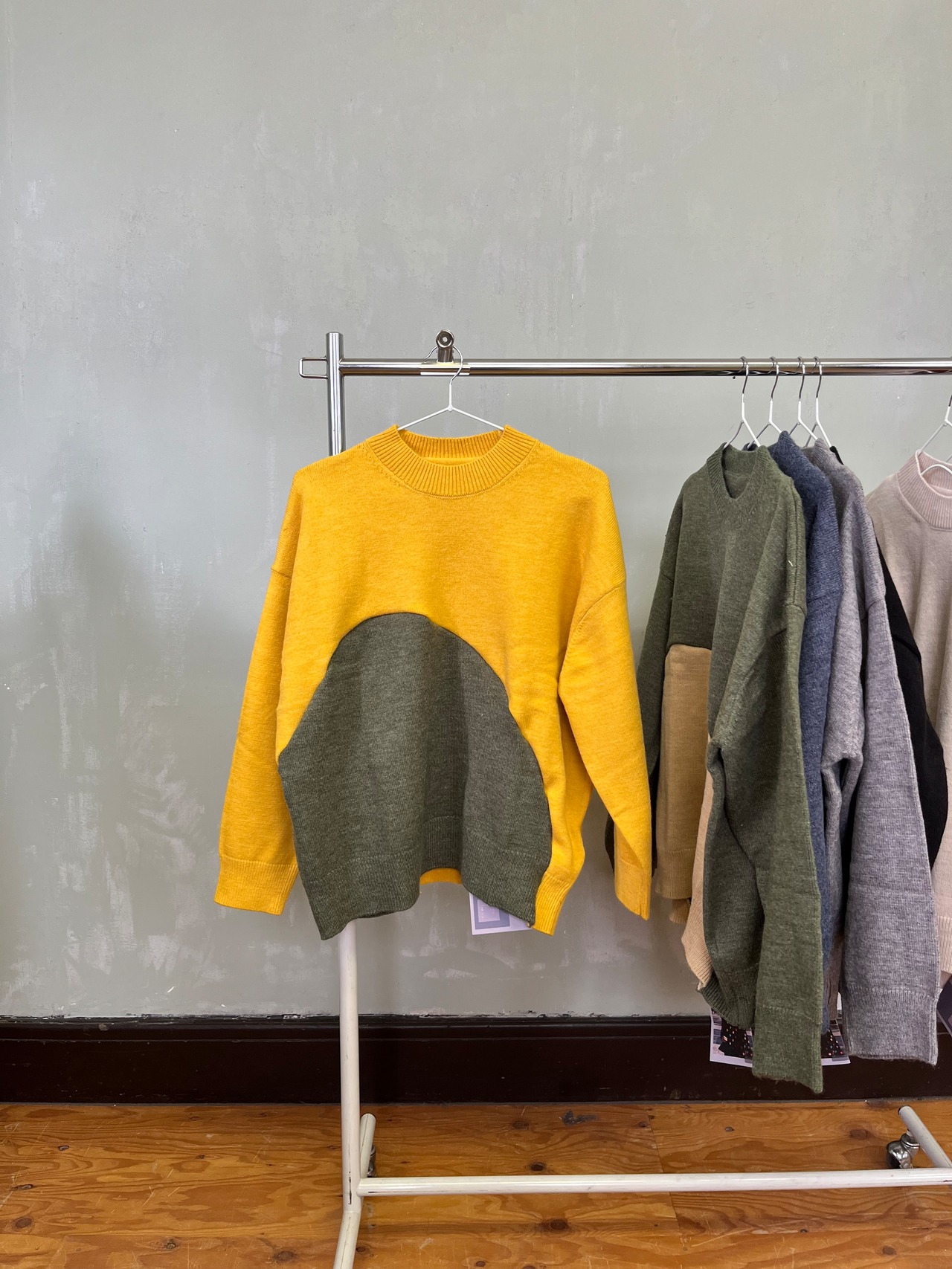 ご来店ありがとうございます!「オンリーワンリメイクニット」をご紹介します。お家で手軽に洗える設計と、ゆったりとしたサイズ感が特徴の一品です。このニットで、リラックスしたスタイルを楽しんでみませんか?