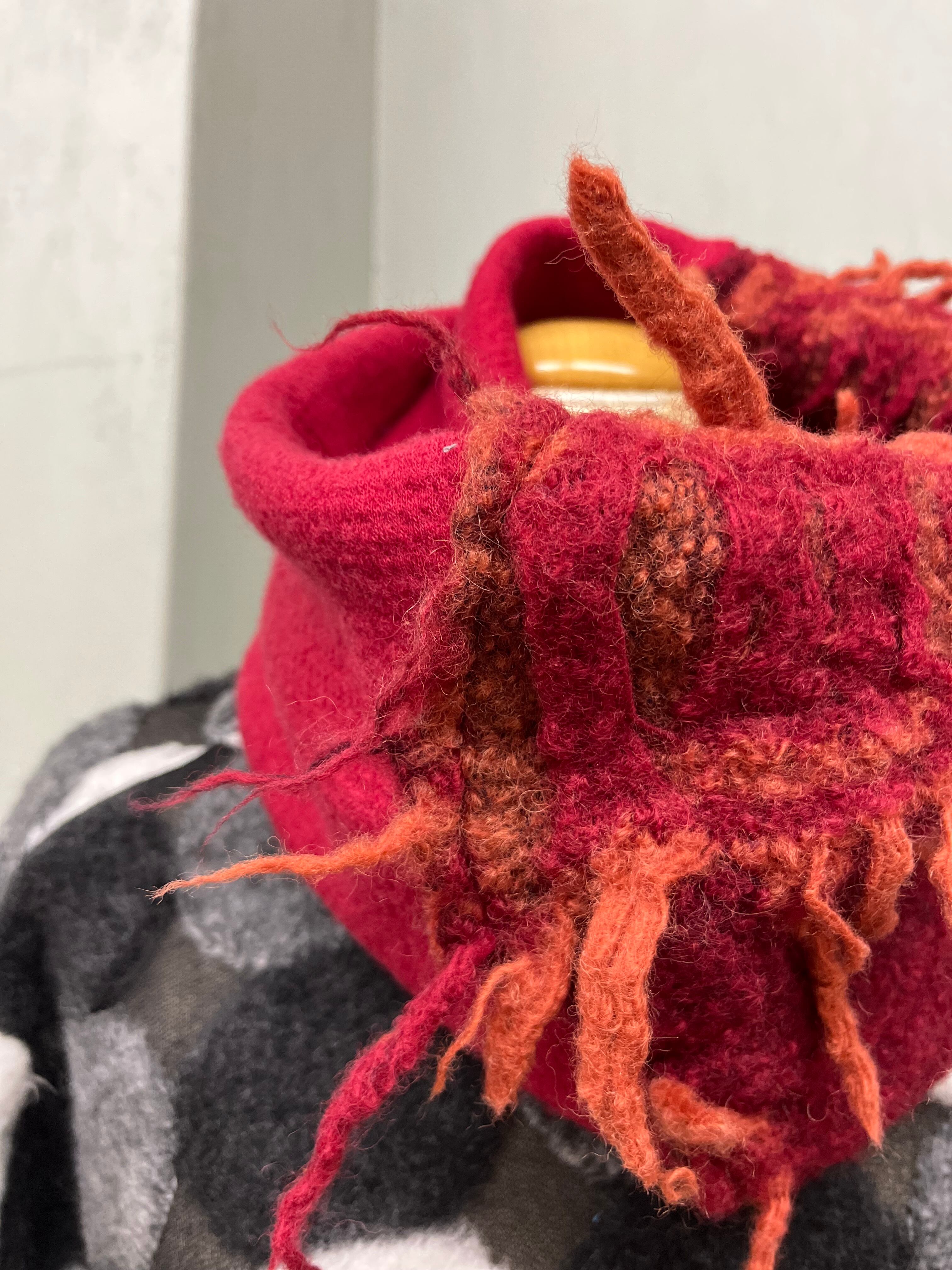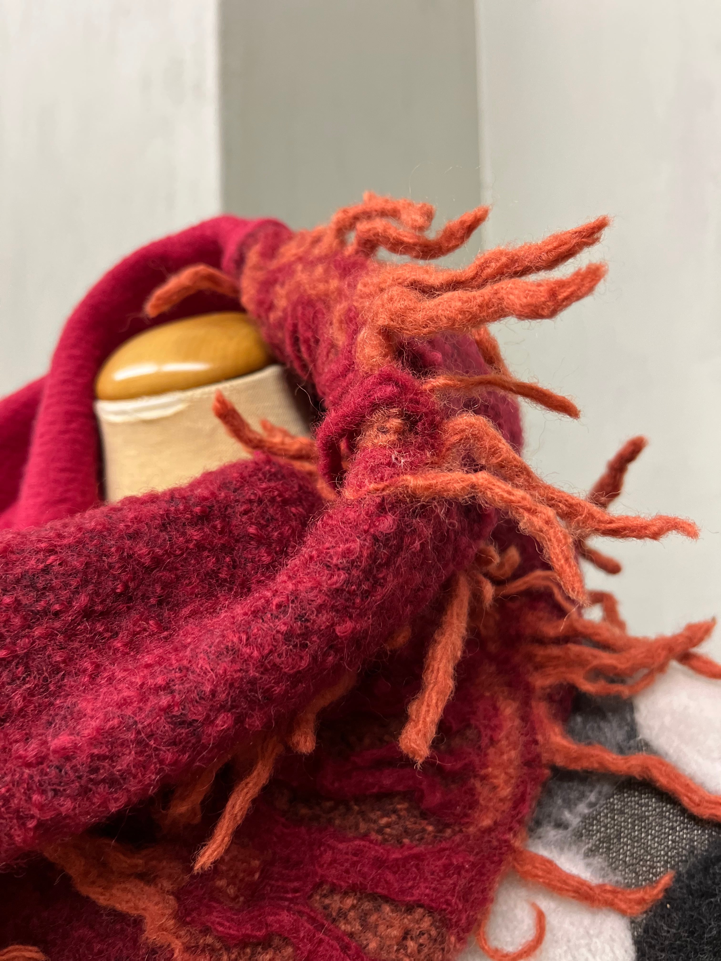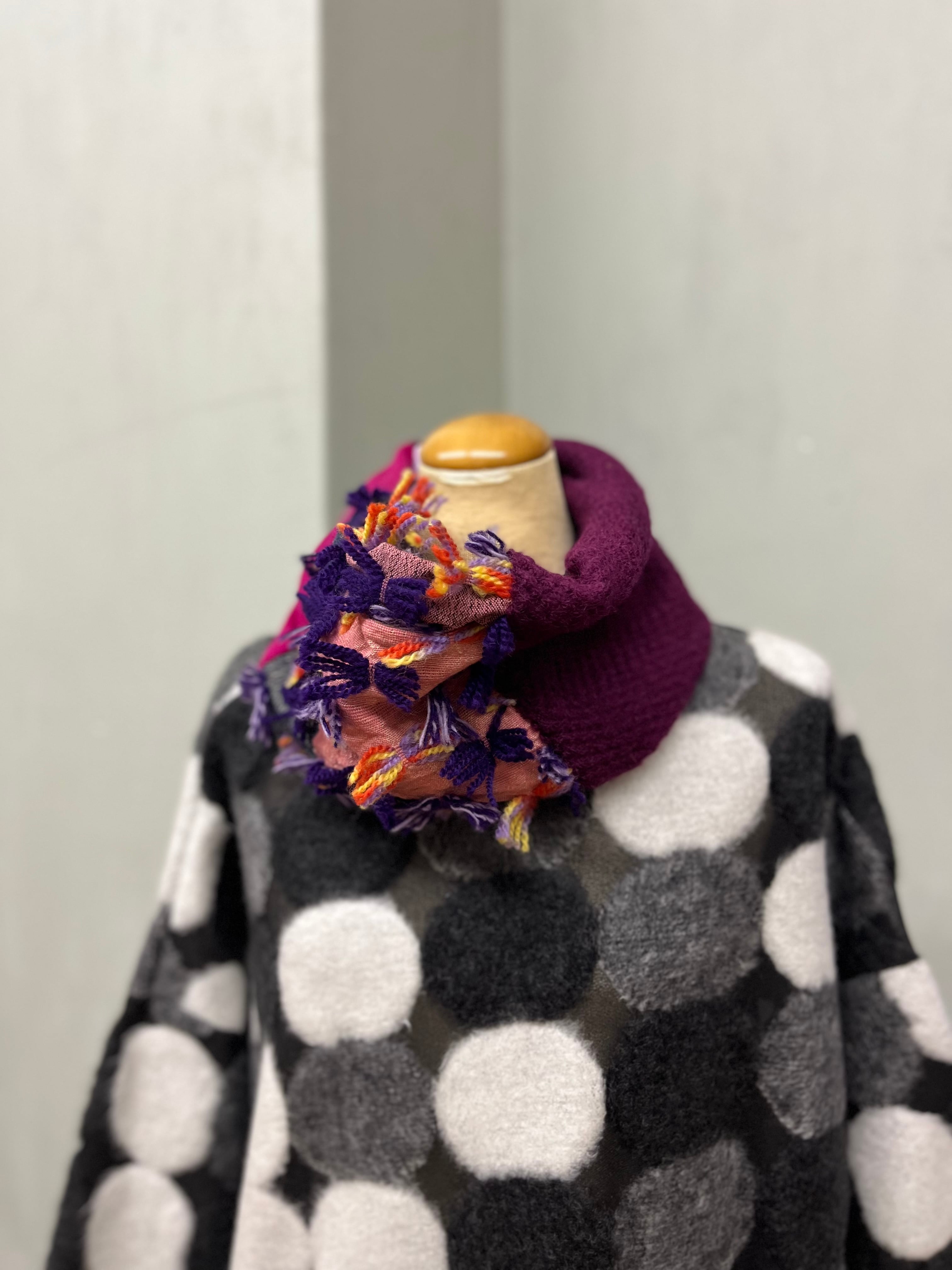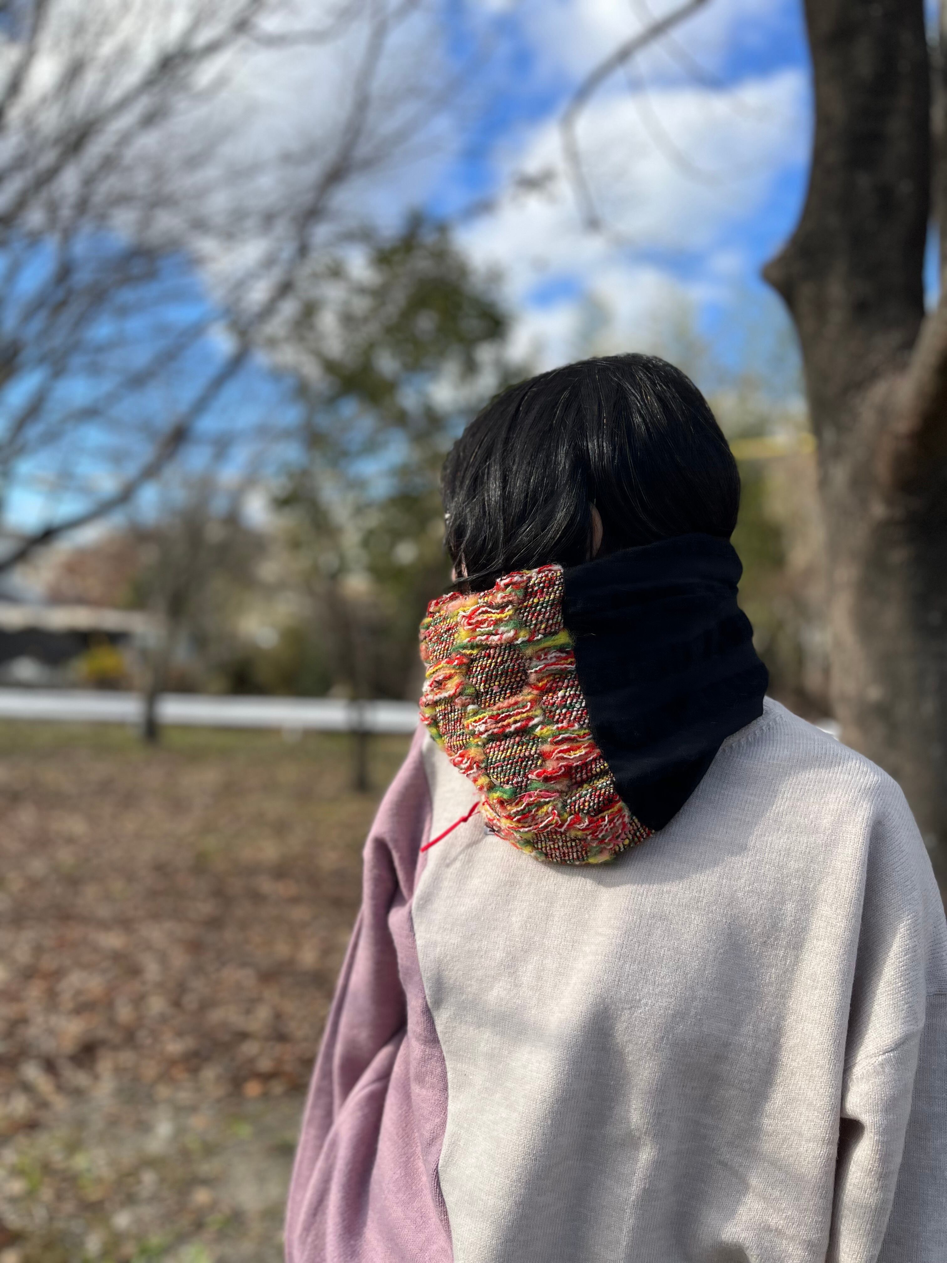 こちらは「尾州ウールのスヌード」です。寒い季節にぴったりなアイテムで、首元を優しく包み込みます。尾州ウールを使用しており、その柔らかな手触りと高い保温性が魅力です。