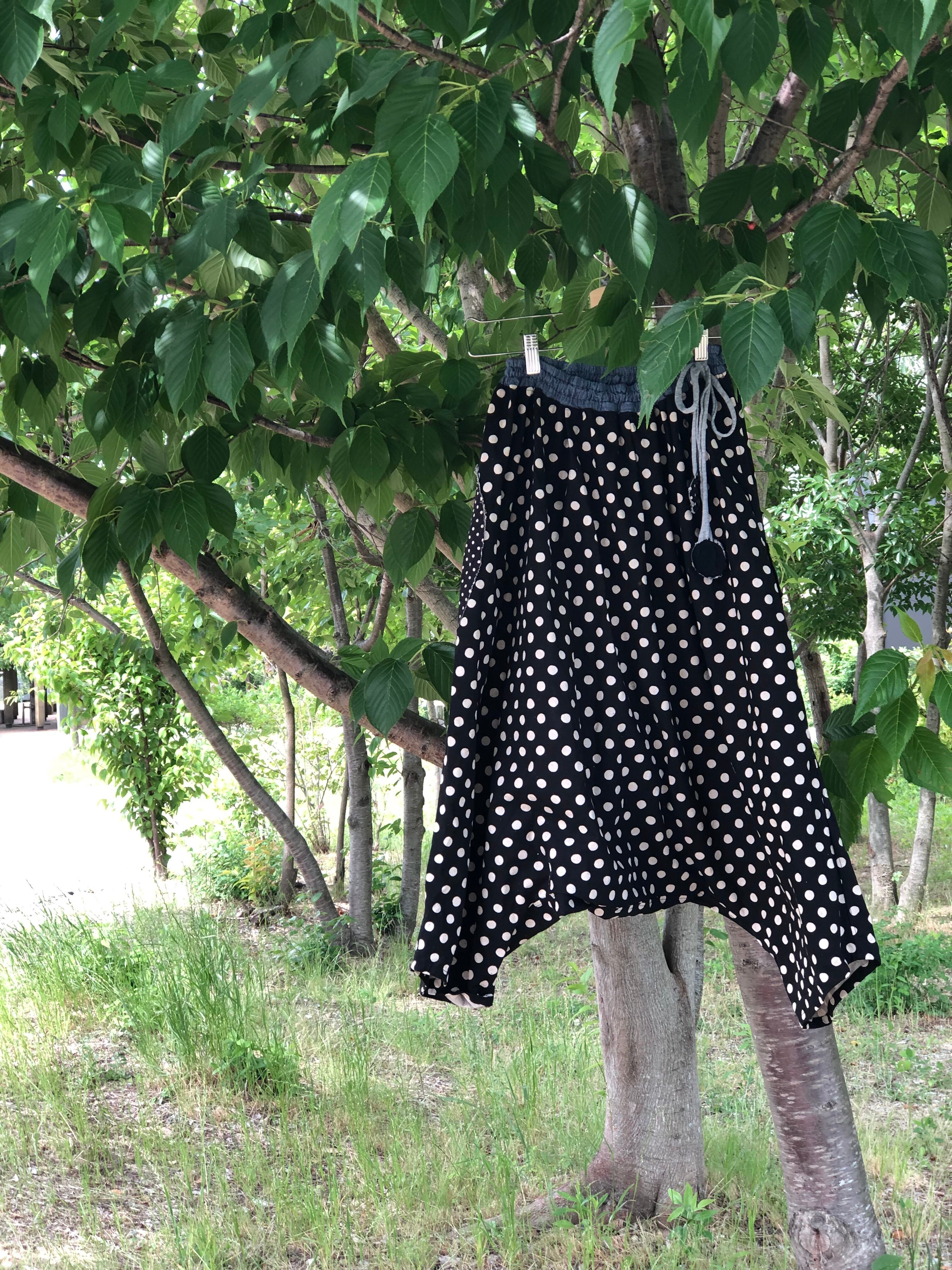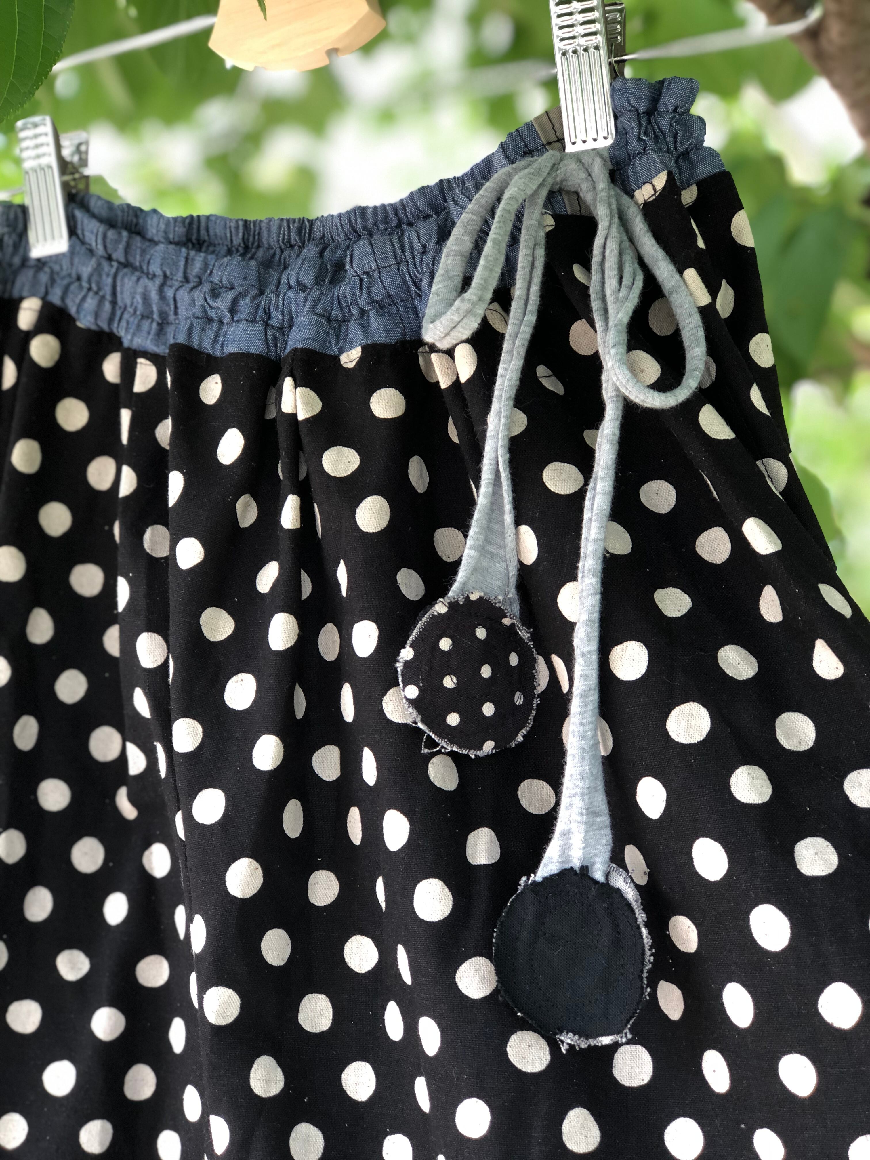 ウエストはゴムで仕上げ、紐で結んで調節するのでフリーサイズです。