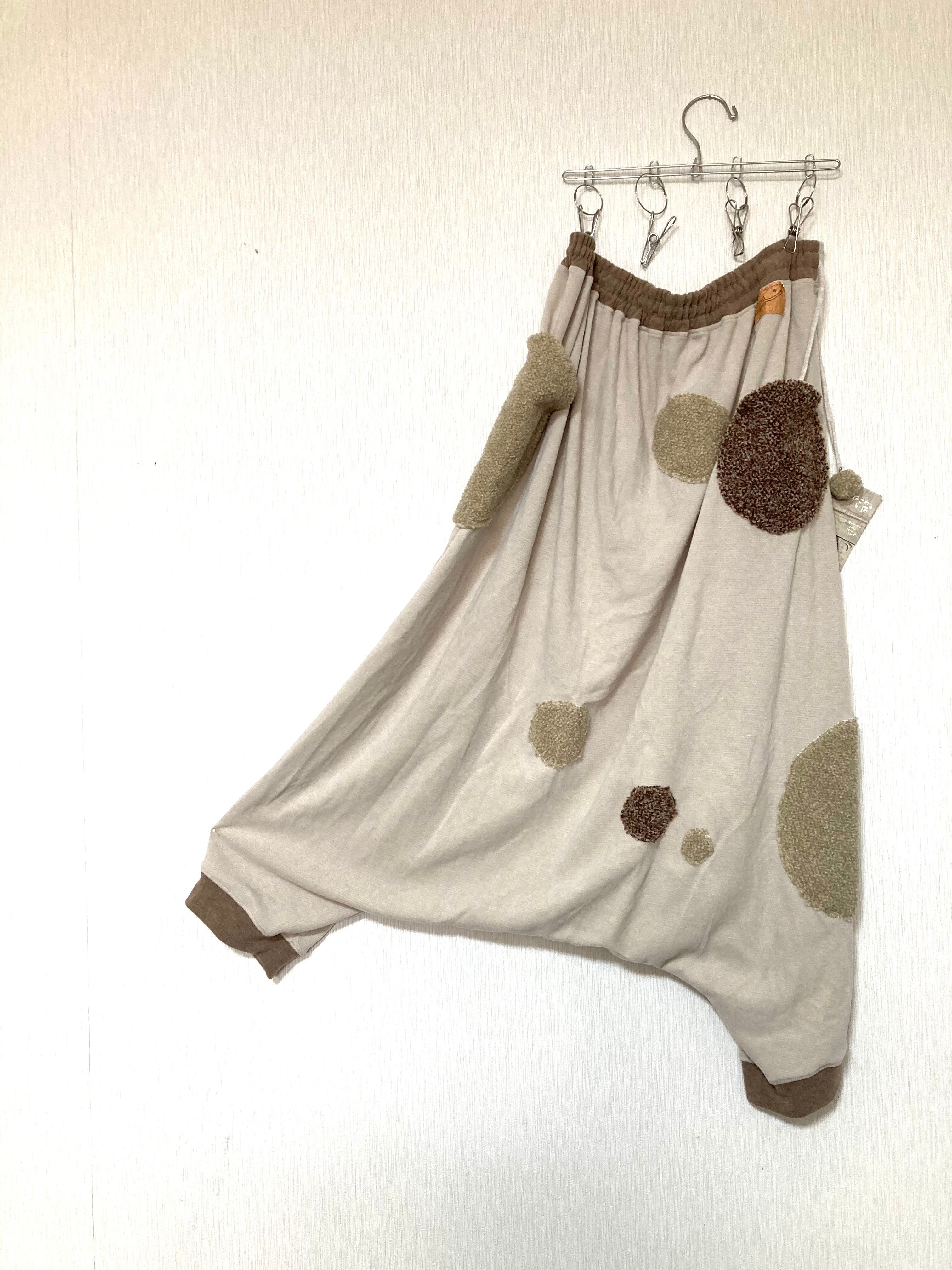 サルエルパンツはモモヒキっぽいのにかわいいのん♪をイメージして作りました。カラフルドットで柔らかいくったりした生地がまたおすすめ☆