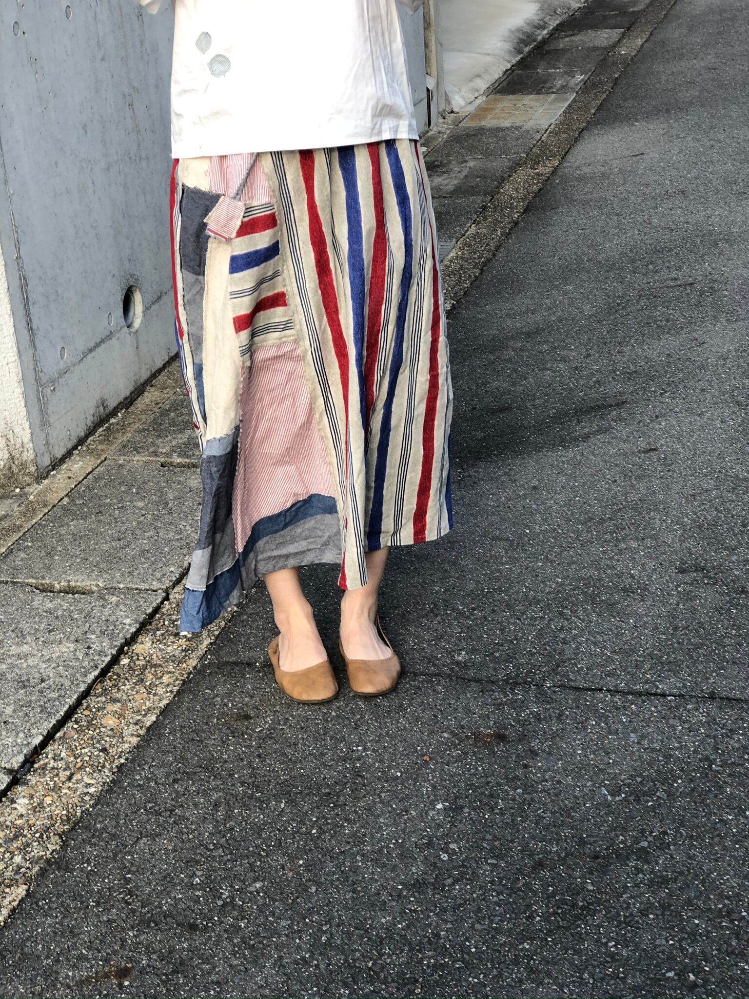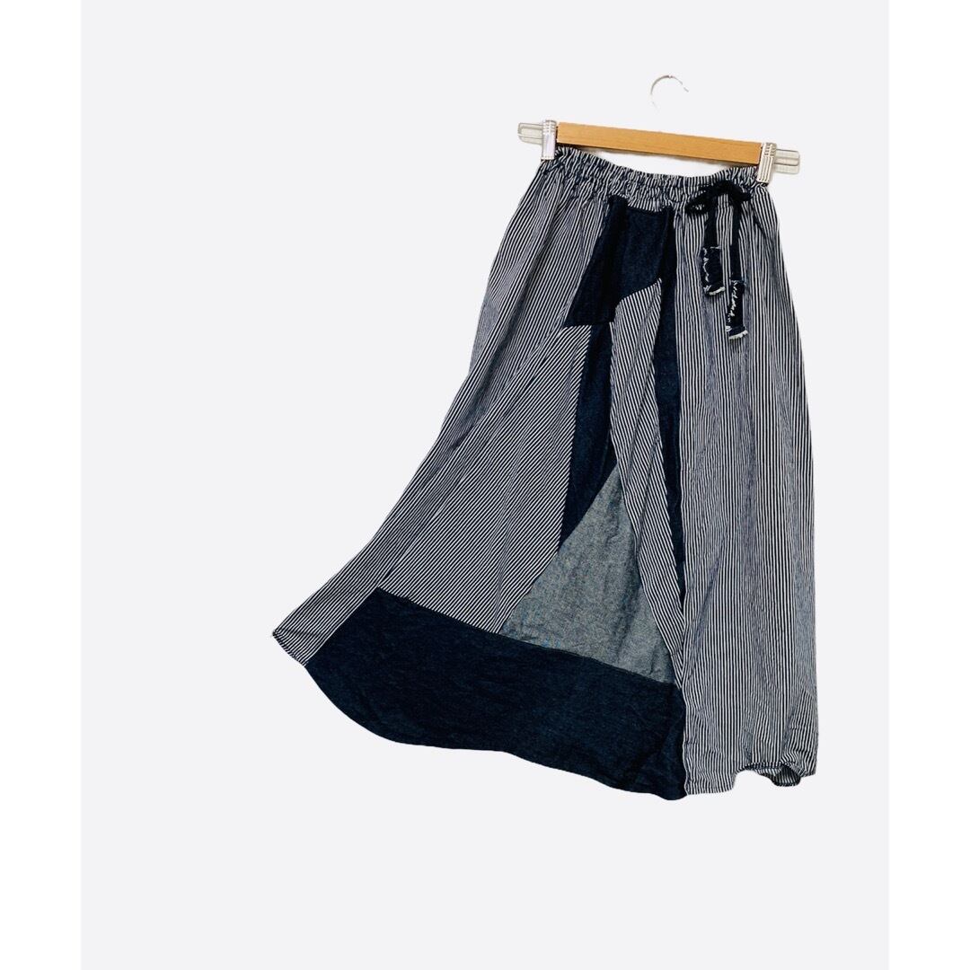 コットン100%のヒッコリーデニムのスカートです。ポイントのところは、色々なデニムをモザイク柄にしました。