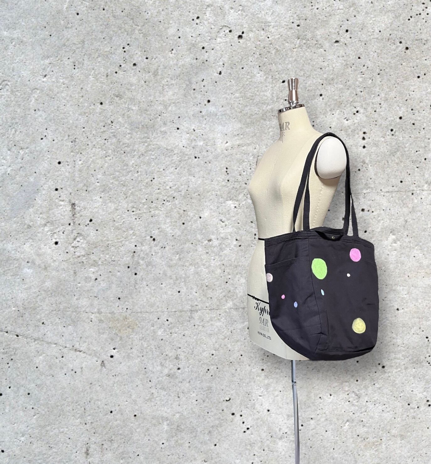 インド綿を使用した、たっぷり入るサイズのカラフルペイントバッグ。各色ごとに異なるオリジナルデザインで、どれも一点もの。ポケットが沢山ついているので小物の整理もラクラクです。ショルダーストラップも付いており、肩掛けや斜め掛けなど、様々なスタイルでお使いいただけます。
