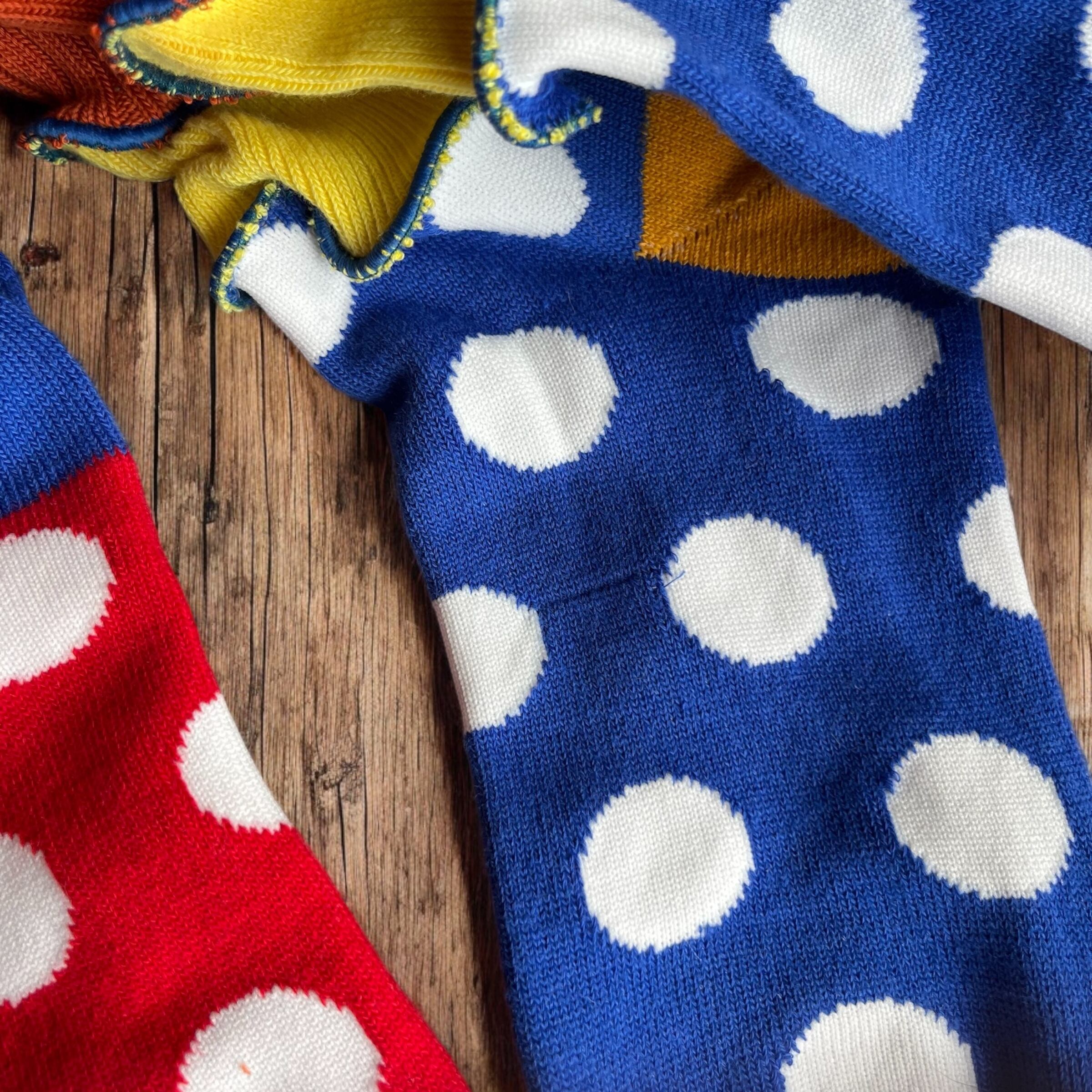 ご来店ありがとうございます!オンリーワンな水玉な靴下、25〜27cmサイズをご用意しました。水玉と色々なカラフルデザインが特徴です。足元からおしゃれを楽しみたい方にぴったりの逸品です。柔らかい素材で履き心地も抜群ですよ。