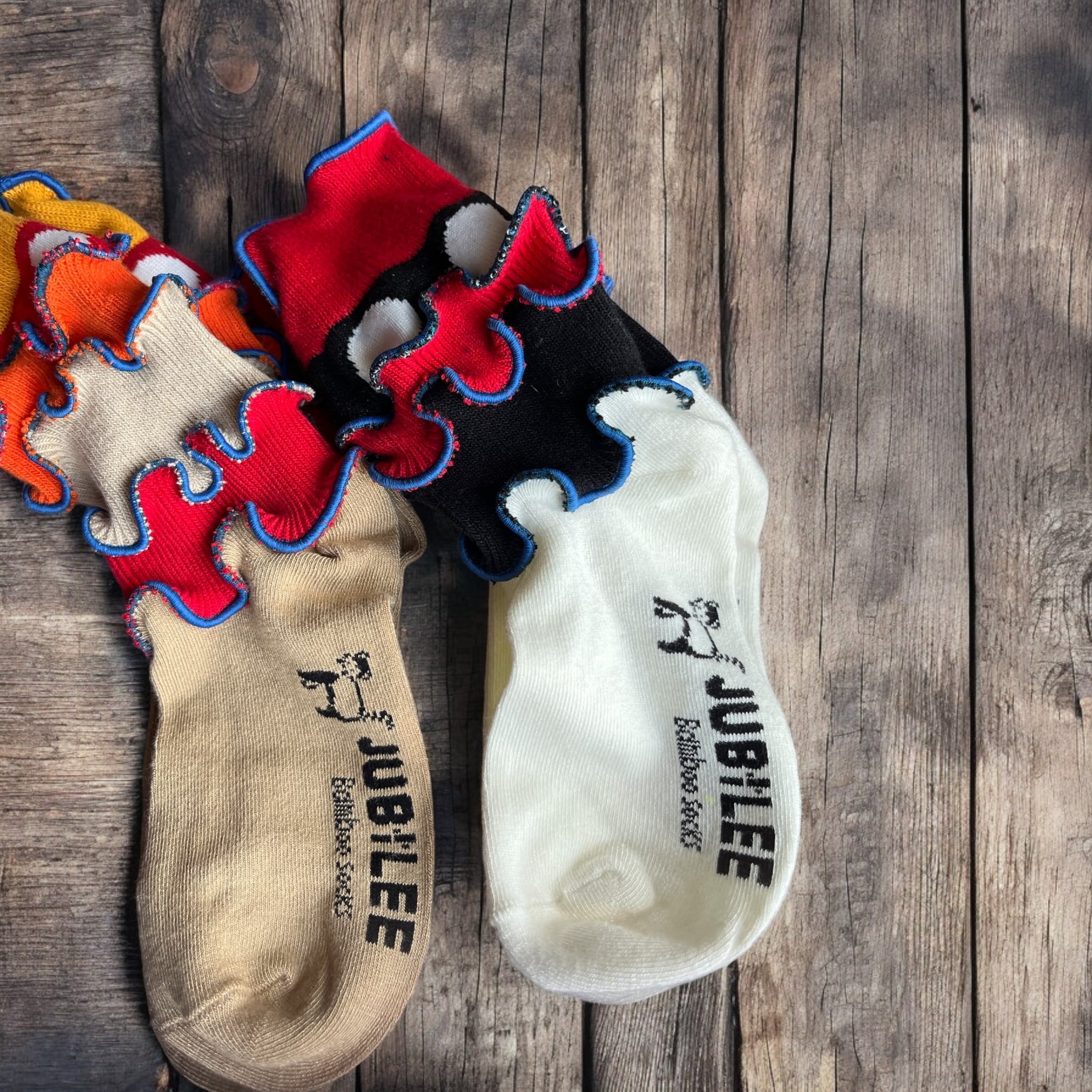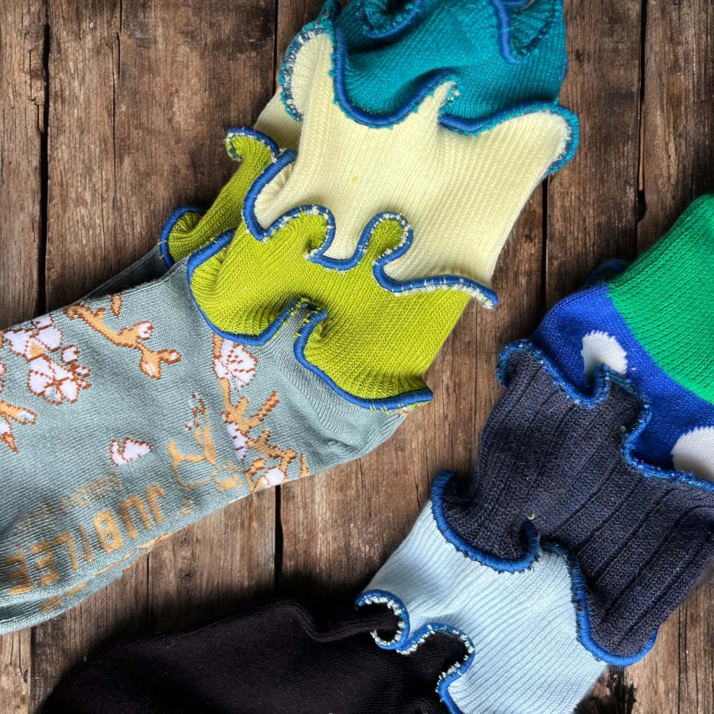 ご来店ありがとうございます!オンリーワンなアートな靴下、22〜25cmサイズをご用意しました。奈良県で生産されたつぎばぎにしあげたデザインが特徴です。足元からおしゃれを楽しみたい方にぴったりの逸品です。柔らかい素材で履き心地も抜群ですよ。