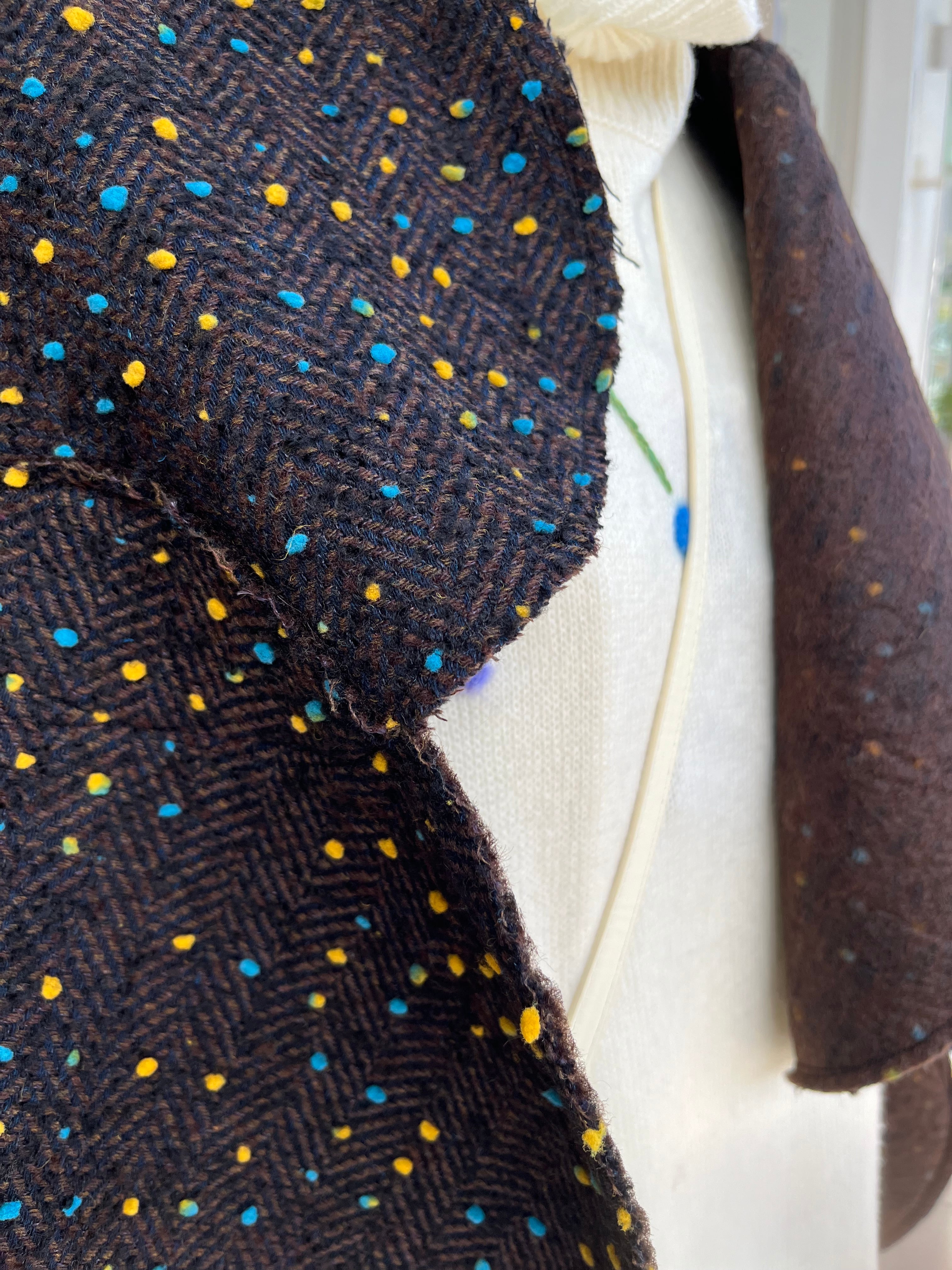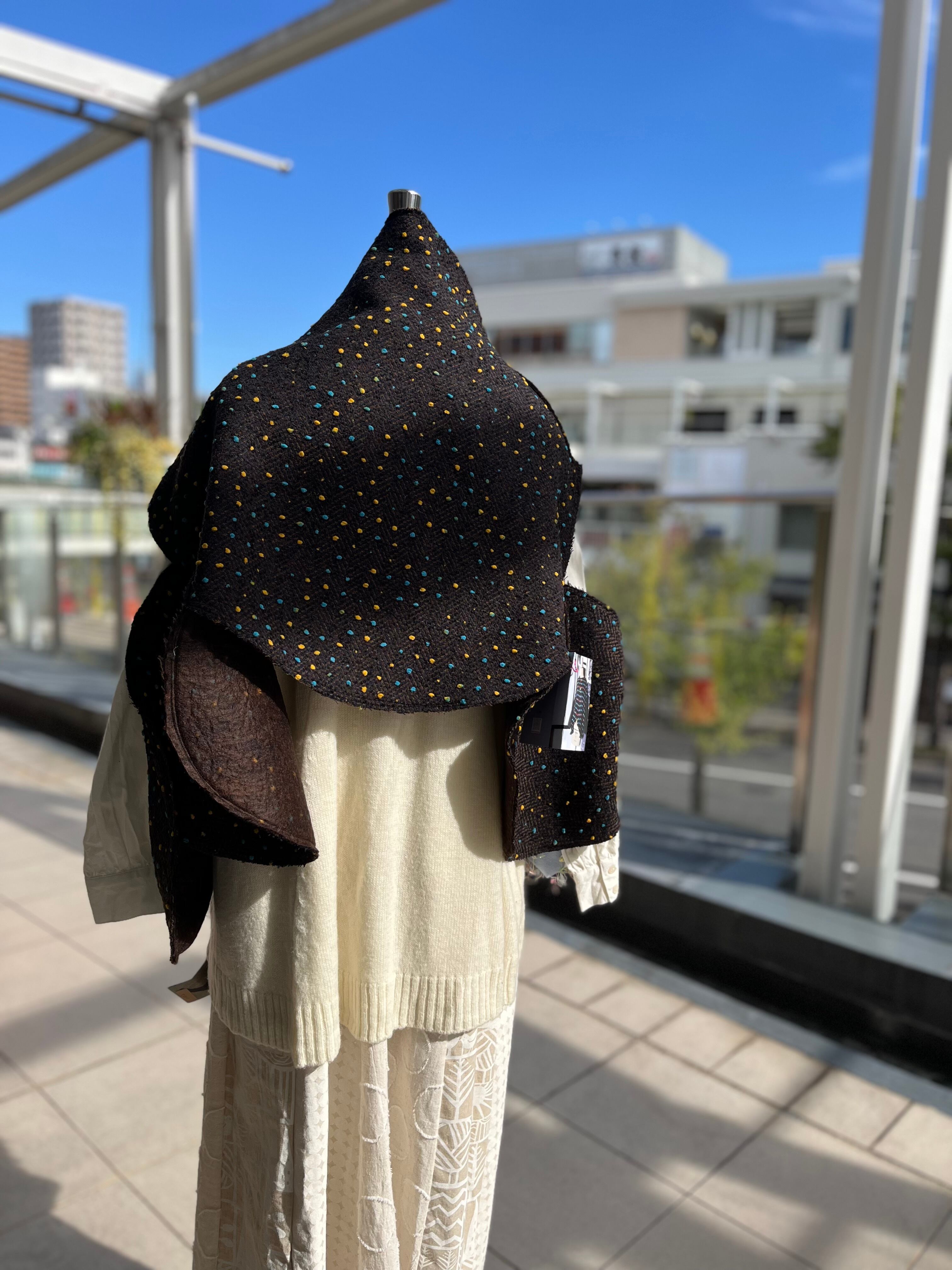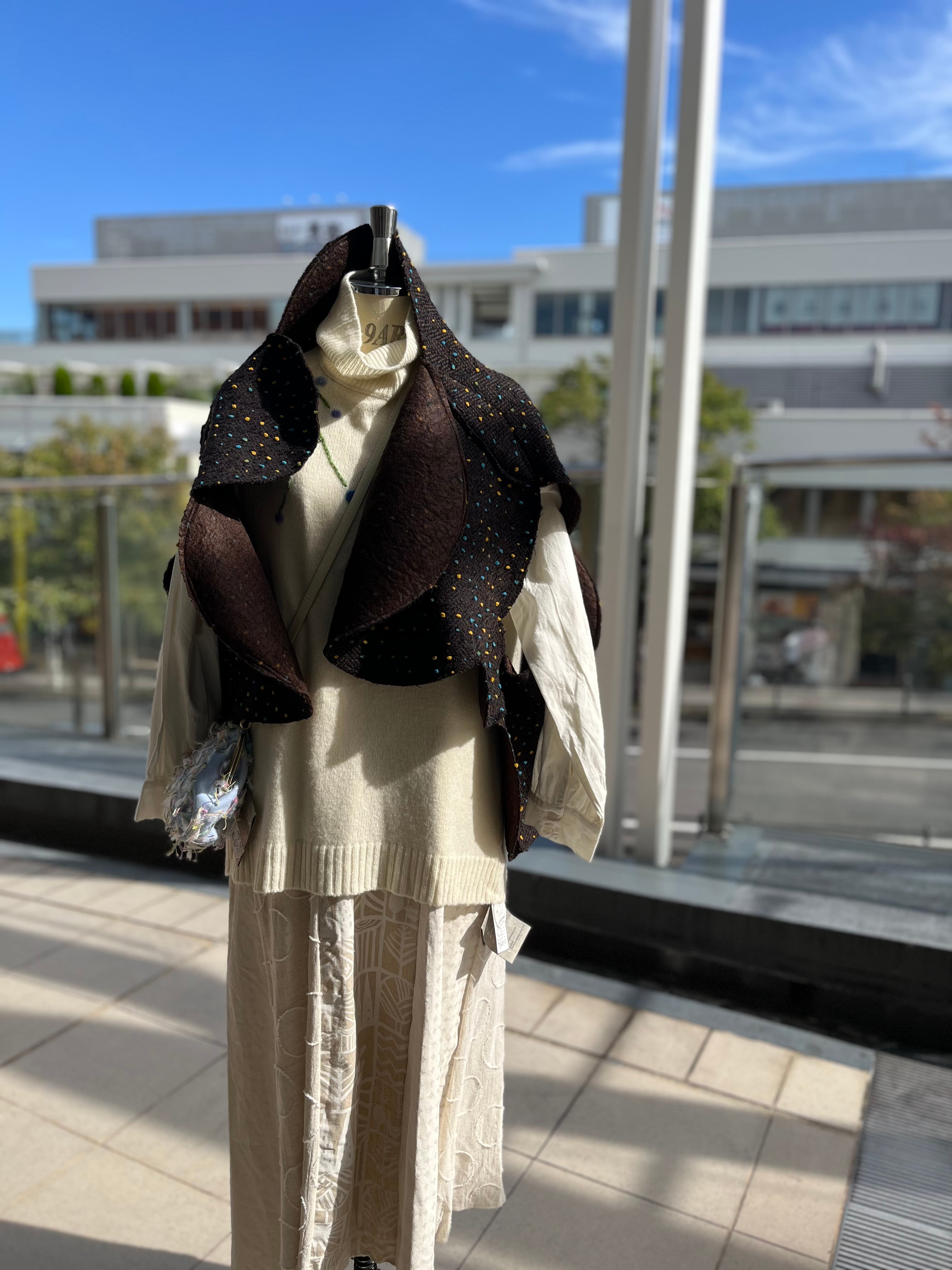 ご来店ありがとうございます!オンリーワン ネップジレをご用意しました。日本の生地を使用し、独自の丸を繋げて作られているこのジレは、フリーカットのデザインが特徴です。スタイルを美しく引き立てながら、洗練された個性を演出する逸品ですよ。