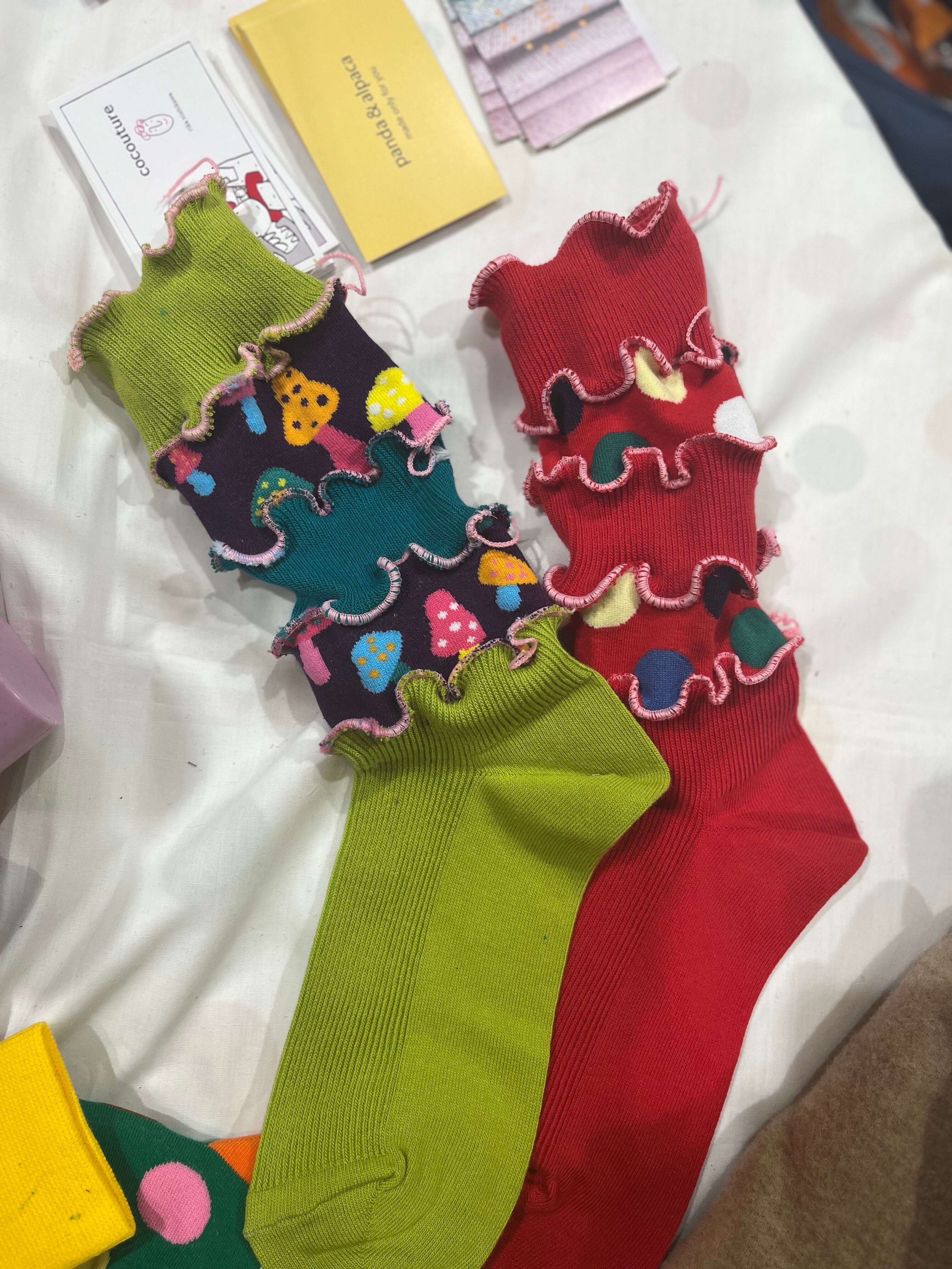 ご来店ありがとうございます!オンリーワンなアートな靴下、22〜25cmサイズをご用意しました。奈良県で生産されたつぎばぎにしあげたデザインが特徴です。足元からおしゃれを楽しみたい方にぴったりの逸品です。柔らかい素材で履き心地も抜群ですよ。