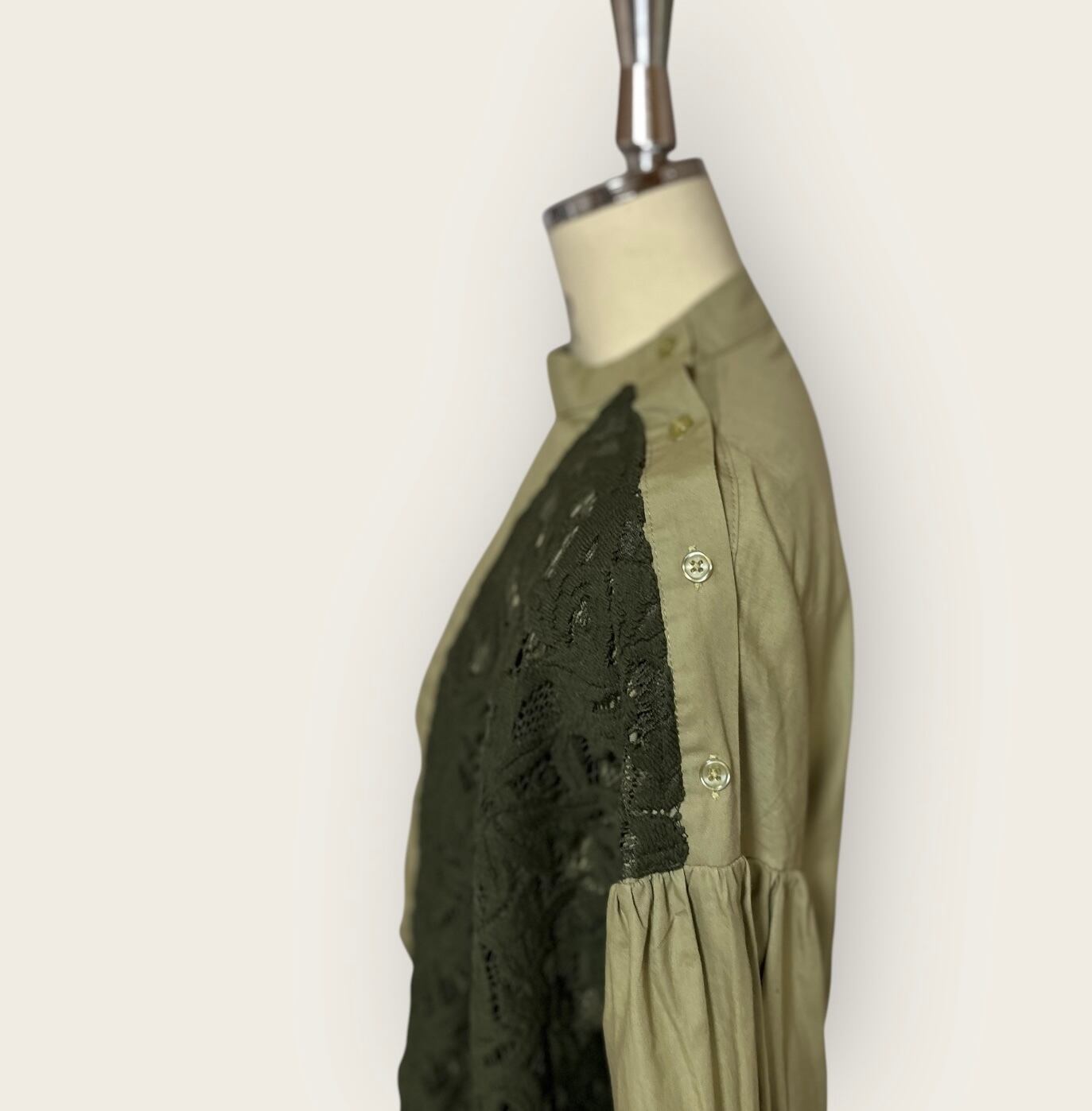 ご来店ありがとうございます!オンリーワンブラウス カーキをお届けします!コットンとトルコレースを使用したこのブラウスは、通気性に優れ、オールシーズン快適に着用できる一品です。足長効果のあるデザインは、スタイルアップをしっかりサポートしてくれます!