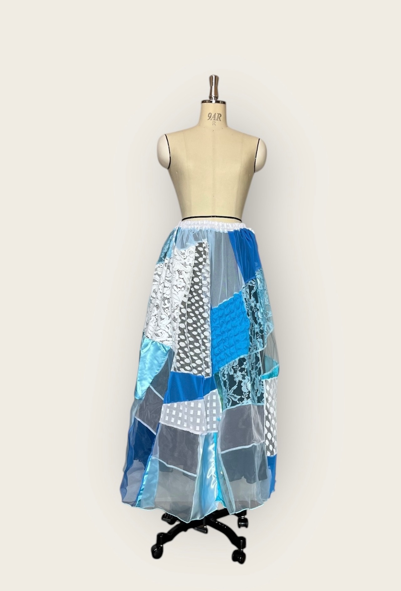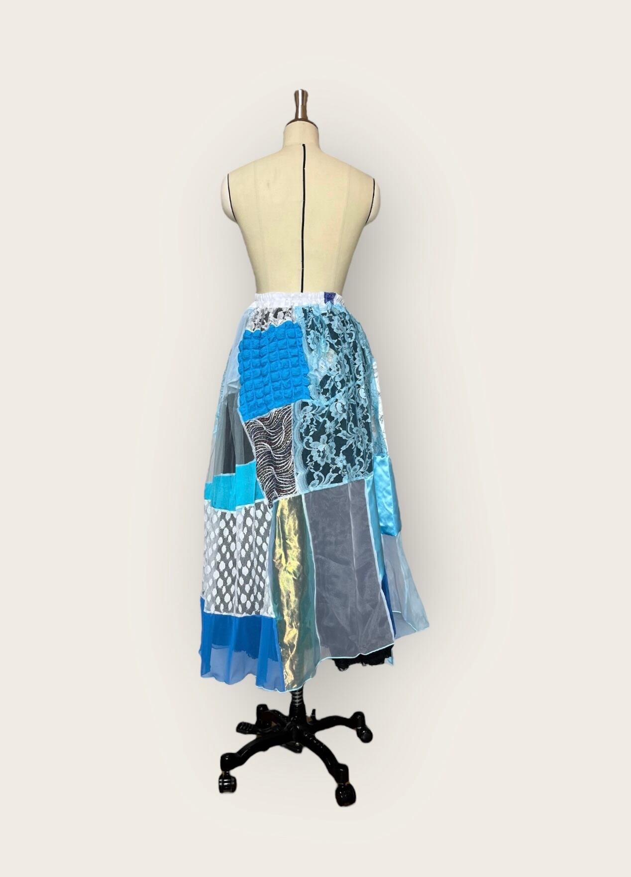 ご来店ありがとうございます!オンリーワン オーバー&アンダースカートをお届けします!カラフルモザイク柄に繋ぎ合わせた様々なレースやチュールを使用したこのスカートは、視覚的な楽しさを提供する一品です。エレガントな裾ウェーブ仕上げが、女性らしい輝きを引き立てます!
